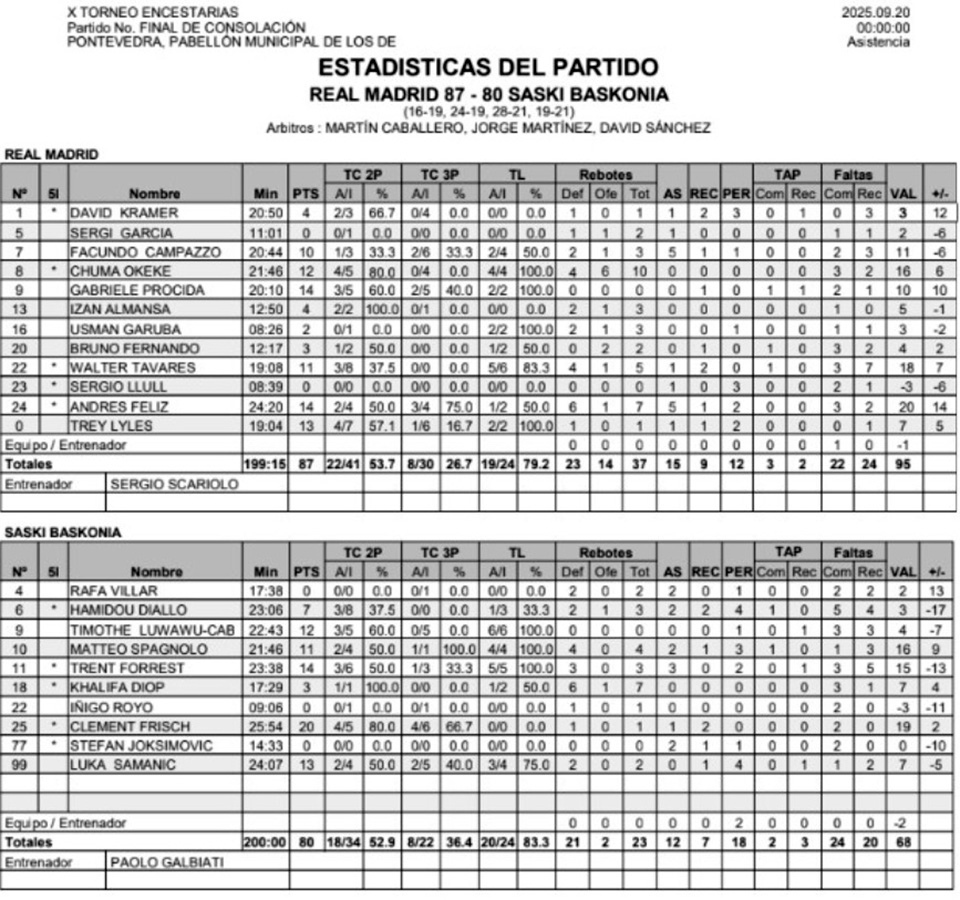 87 - Real Madrid (16+24+28+19): Feliz (14), Sergio Llull (0), Krämer (4), Okeke (12) y Tavares (11) -cinco inicial- Sergi García (0), Almansa (4), Garuba (2), Fernando (3), Campazzo (10), Trey Lyles (13) y Gabriele Procida (14).