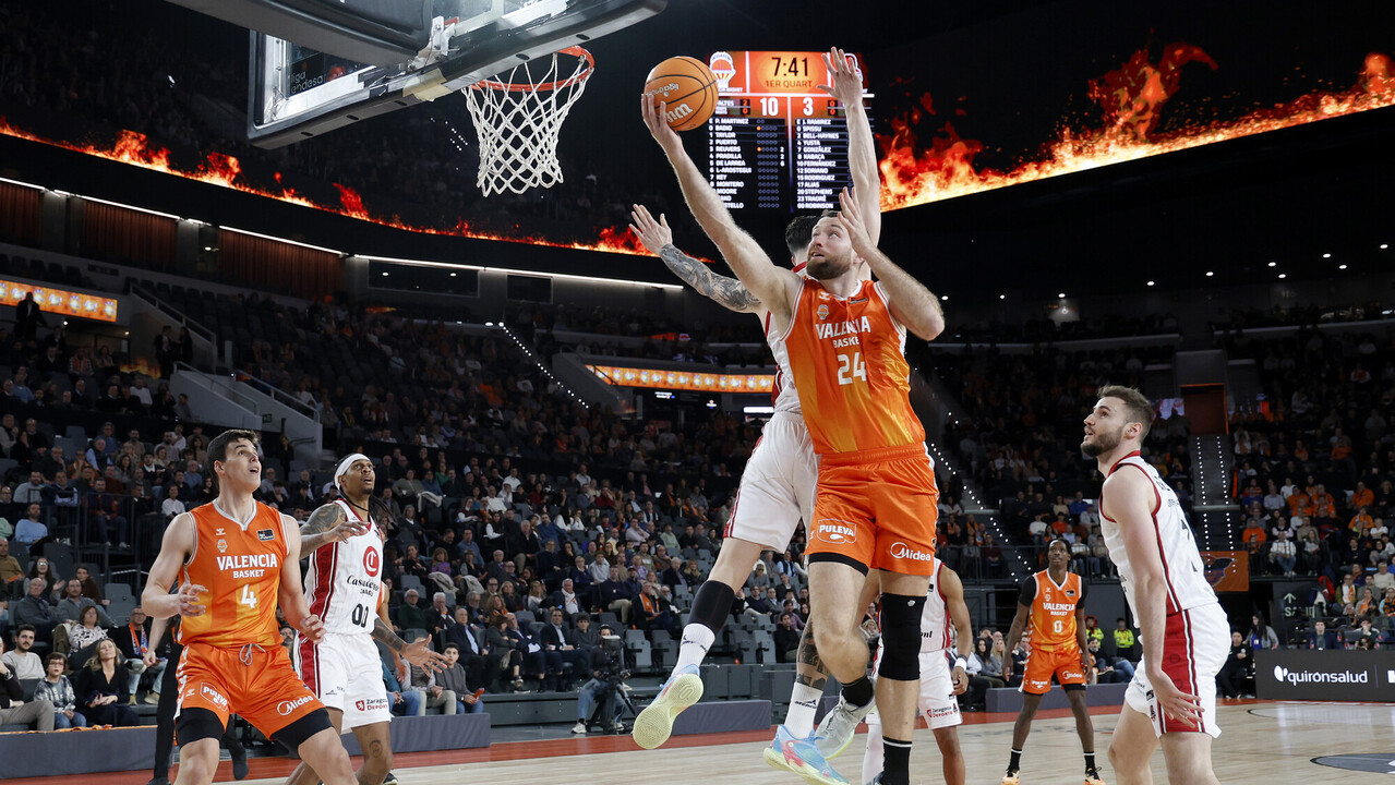 Regresó el Valencia Basket a la pista sin Nate Reuvers, que sufrió un esguince en el primer cuarto y que aunque volvió a jugar en la primera parte, ya no lo hizo en la segunda. Sin embargo, el parón refrescó las piernas de los locales, que pudieron apretar algo más la primera línea y engordar su renta a la carrera con Omari Moore y Jean Montero de estiletes (64-46, m.23).
