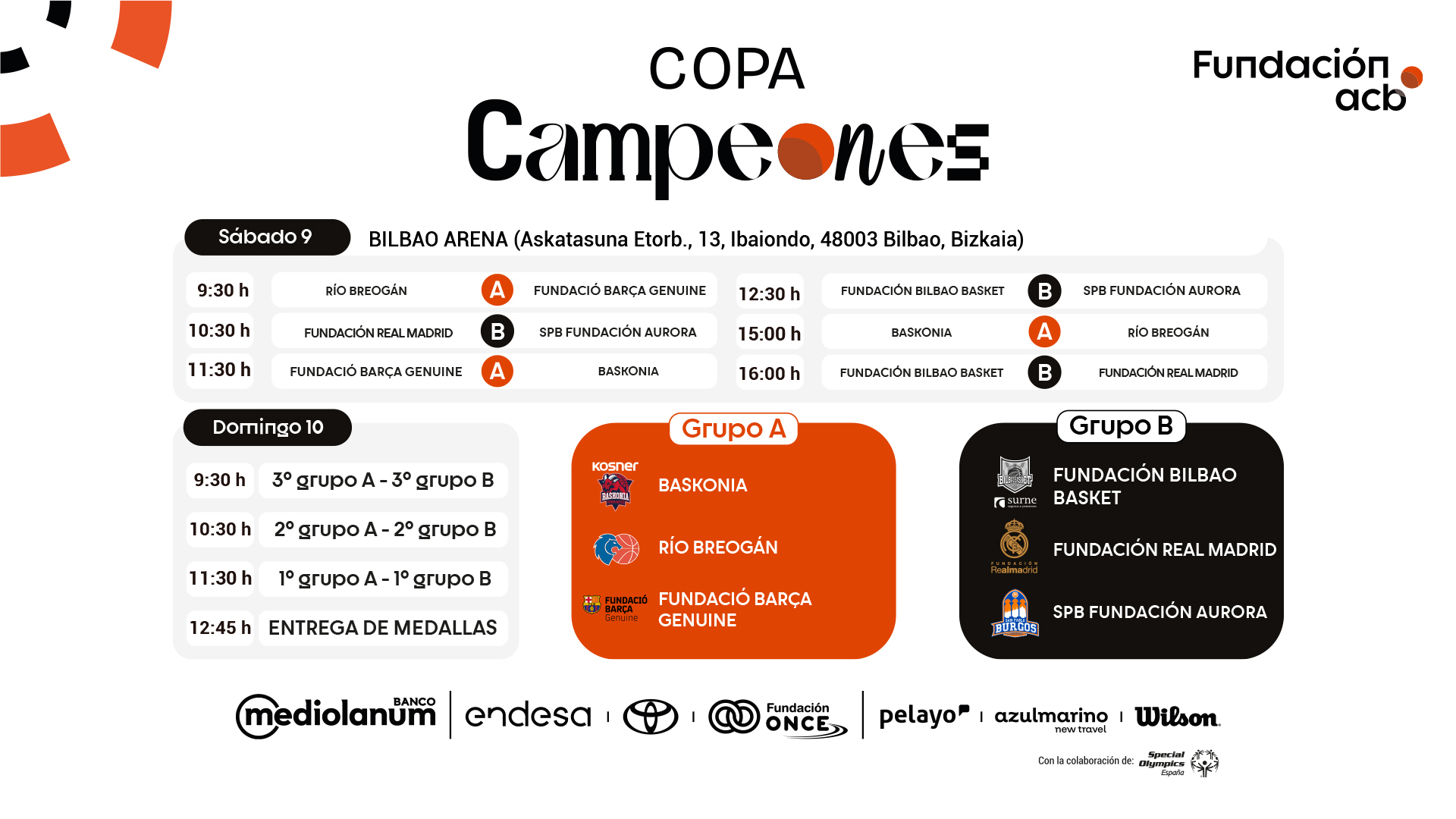 Contando una vez más con el inestimable apoyo de Banco Mediolanum, Endesa, Toyota y Fundación ONCE, así como a la ayuda de Pelayo, Azulmarino y Wilson y la colaboración de Special Olympics España, la Copa Campeones llegará a Bilbao para poner un broche de oro a esta primera campaña que comenzó el pasado mes de enero en L’Alqueria del Basket en Valencia y realizó su segunda parada en el Nou Congost de Manresa.