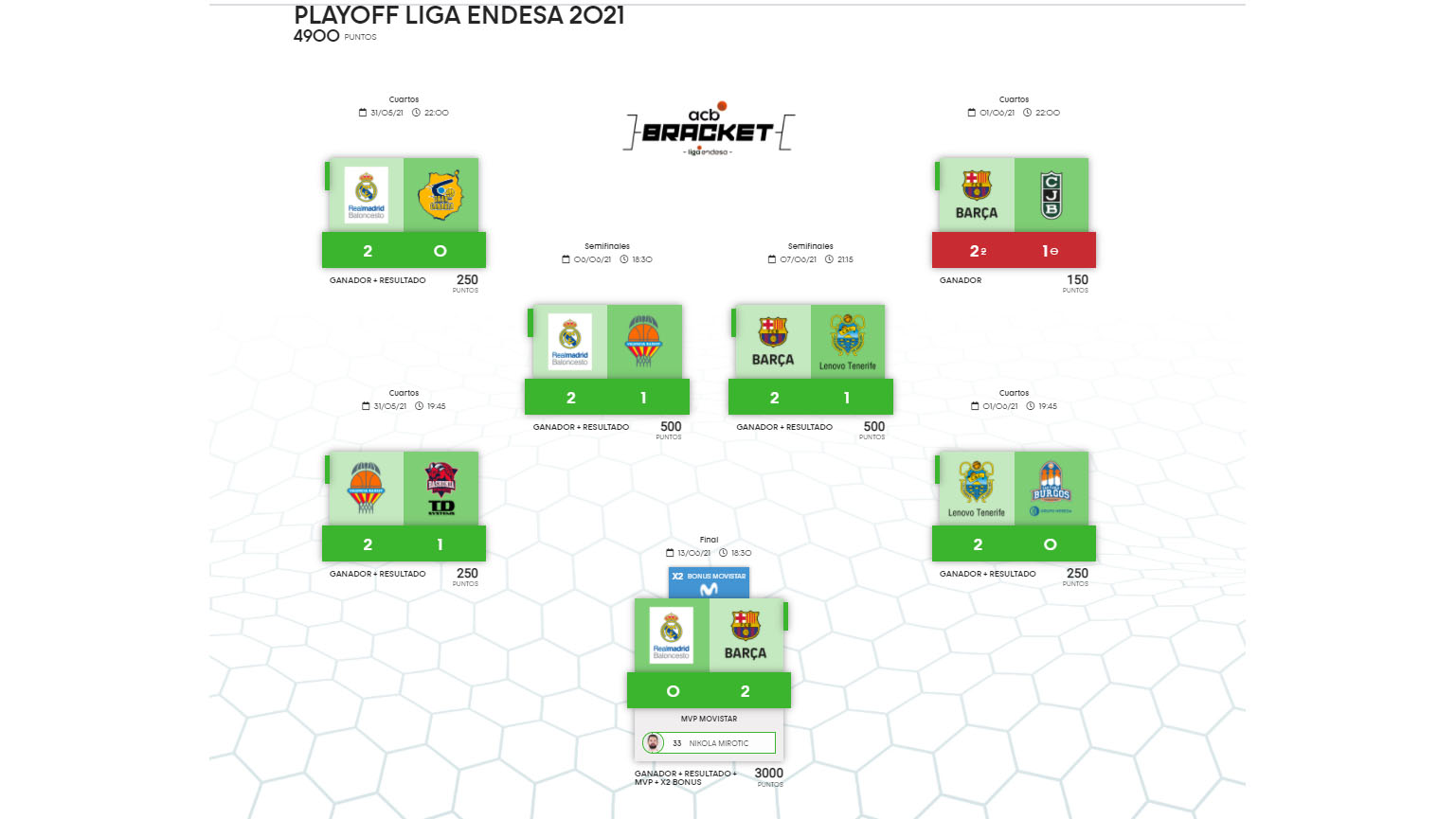Josecc71 se lleva la gloria después de hacer un Bracket del Playoff casi perfecto: tan solo erró en el resultado del enfrentamiento de cuartos de final entre Barça y Joventut. Se le escaparon nada más 100 puntos (4.900 de 5.000). El resto, un PEDAZO DE PLENO.