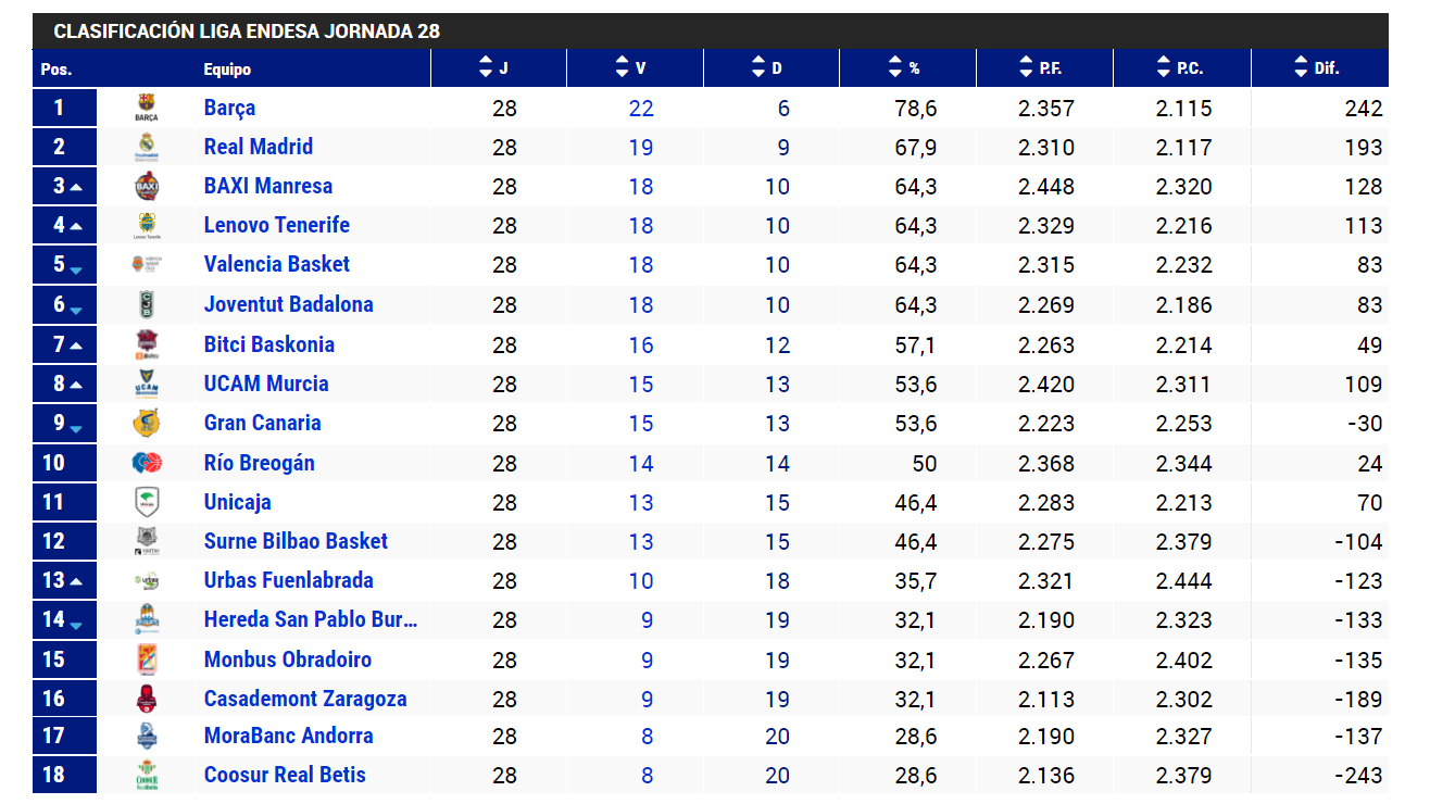 Por abajo, el mundo al revés: han ganado los tres últimos antes de esta jornada. El Coosur Real Betis y el Hereda San Pablo Burgos lo han logrado ante Valencia Basket y Joventut Badalona, tercero y cuarto, y el Casademont Zaragoza en duelo directo contra el Monbus Obradoiro.