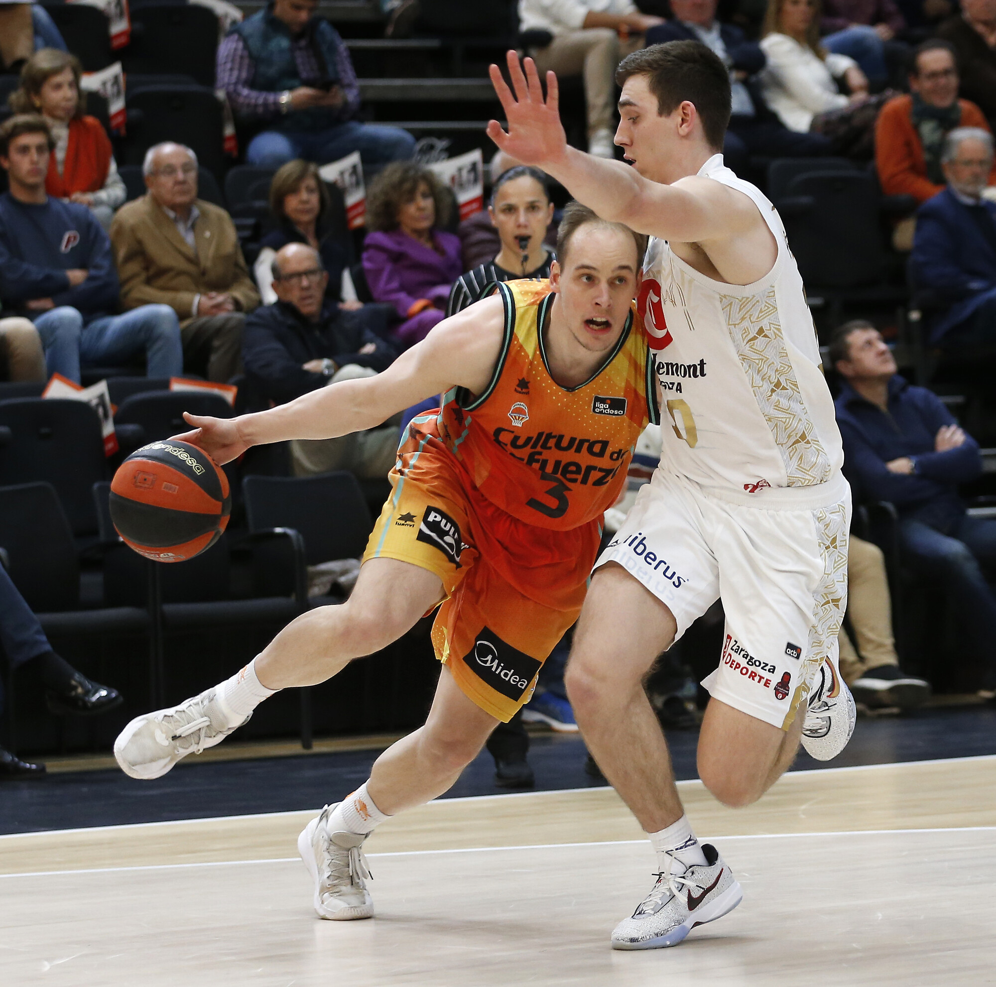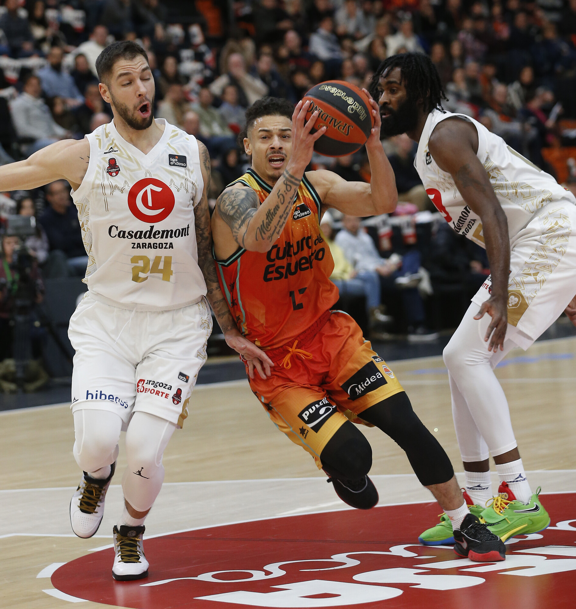 VBC 42-31 CAZ (DESCANSO). El Valencia Basket se va al intermedio manando con autoridad. Su diferencia a favor llegó a ser de +15 a falta de minuto y medio para el final del 2Q, sin embargo dos acciones de Aday Mara maquillaron el marcador. En el equipo local, mucho acierto en el tiro (6/9, 66%) y un gran abanico de opciones (todos los jugadores con minutos han anotado excepto Puerto. El Casademont Zaragoza, sufriendo mucho por culpa de las pérdidas (12).