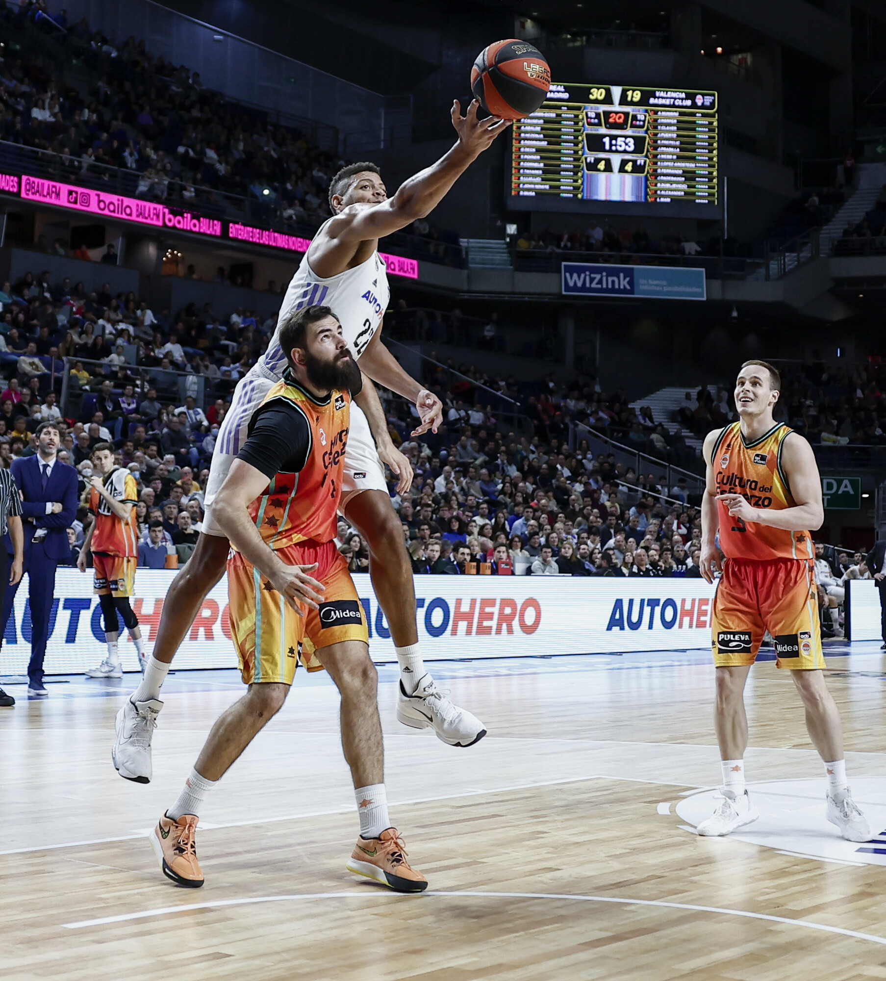 RMB 32-27 VBC (DESCANSO). Domina el Real Madrid al descanso, pero el Valencia Basket ha conseguido reducir la ventaja en el marcador, que llegó a ser de 15 puntos... Y hasta pudo reducirse hasta (solo) el menos 3 si hubiera entrado un triple en el último suspiro del 2Q. El conjunto taronja, condenado en el inicio del partido por unos porcentajes de acierto mejorables: 6/21 (28%) en tiros de dos y 4/17 (23%) en triples.