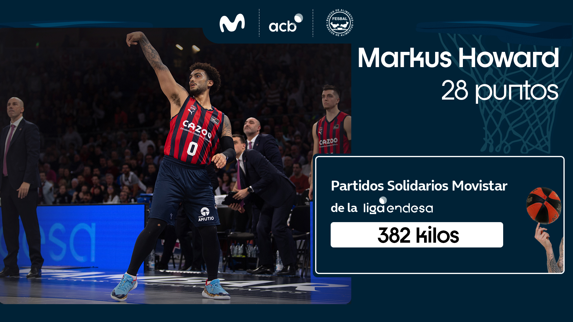 Markus Howard, con sus 28 puntos anotados, es el Jugador Más Solidario de la jornada. Él solito ha donado con su talento 382 kilos de comida en Los Partidos Solidarios Movistar.