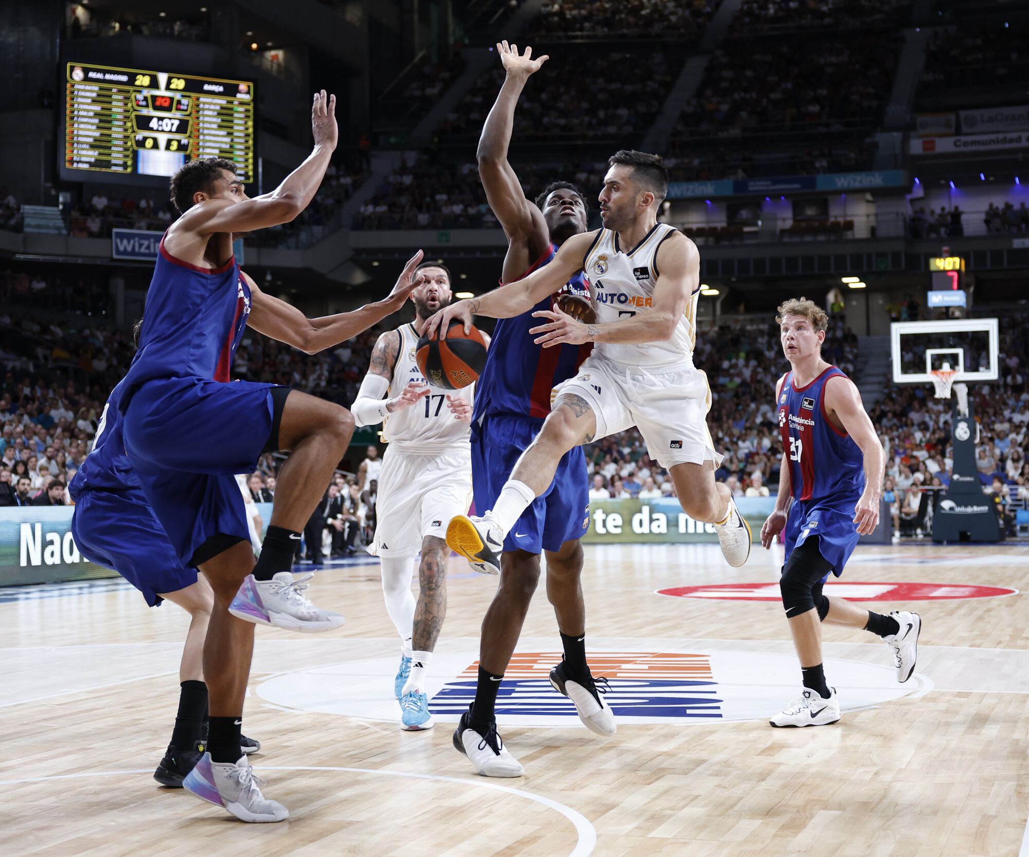 BAR 48-41 RMB (min. 23). El Real Madrid pega otro empujón y consigue acercarse aún más en el marcador. Tiene que pararlo Roger Grimau. En lo que parece algo normal en esta loca Jornada 28, pero no lo es, los visitantes han conseguido entrar en partido pese a que han llegado a perder de 21. ¡Ninguna ventaja está a salvo en la Liga Endesa!