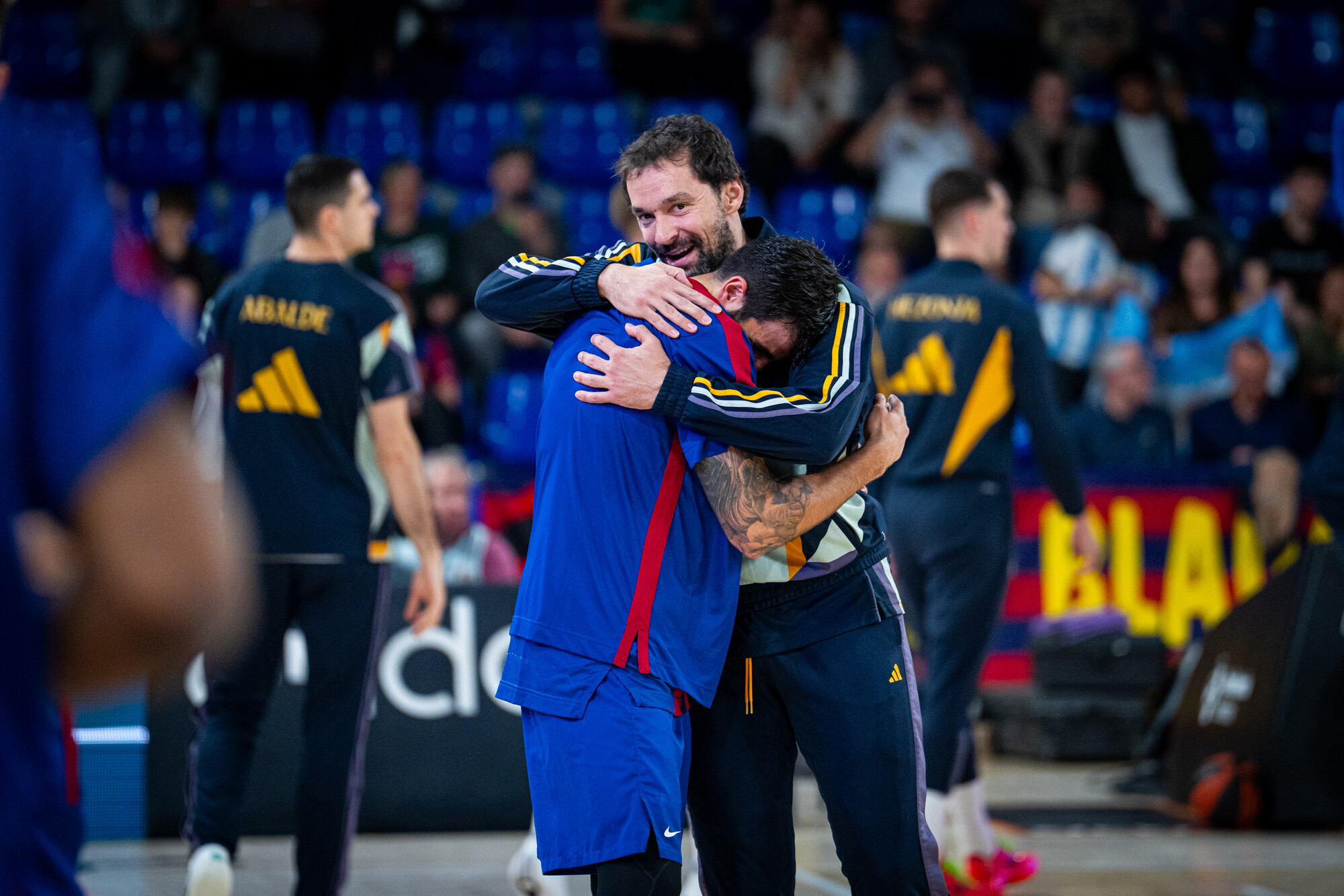 El abrazo de Ricky Rubio y Sergio Llull. Fotón donde los haya. El genio de El Masnou vuelve a un Clásico casi trece años o, lo que es lo mismo, 4.747 días después. El último que jugó terminó en prórroga...