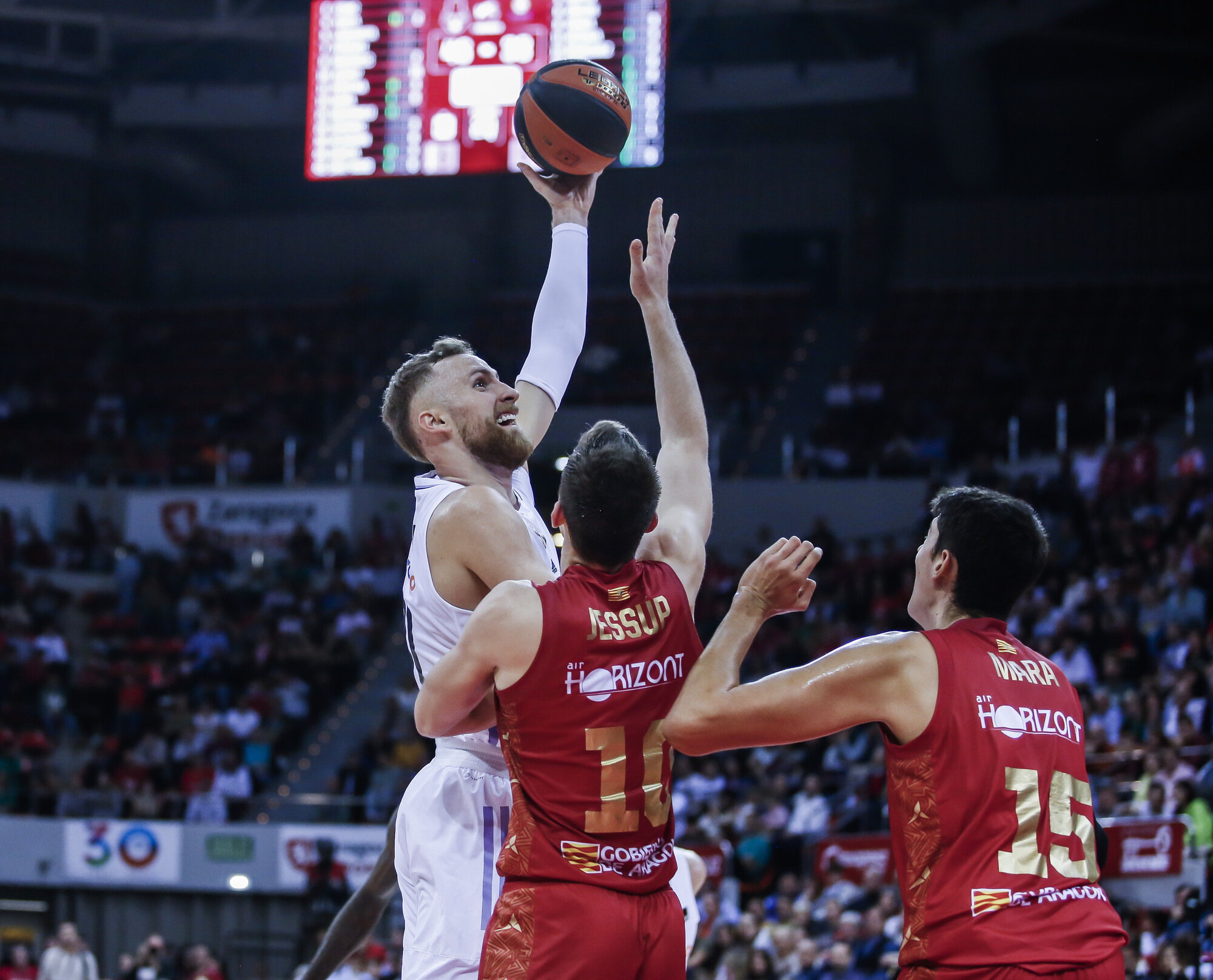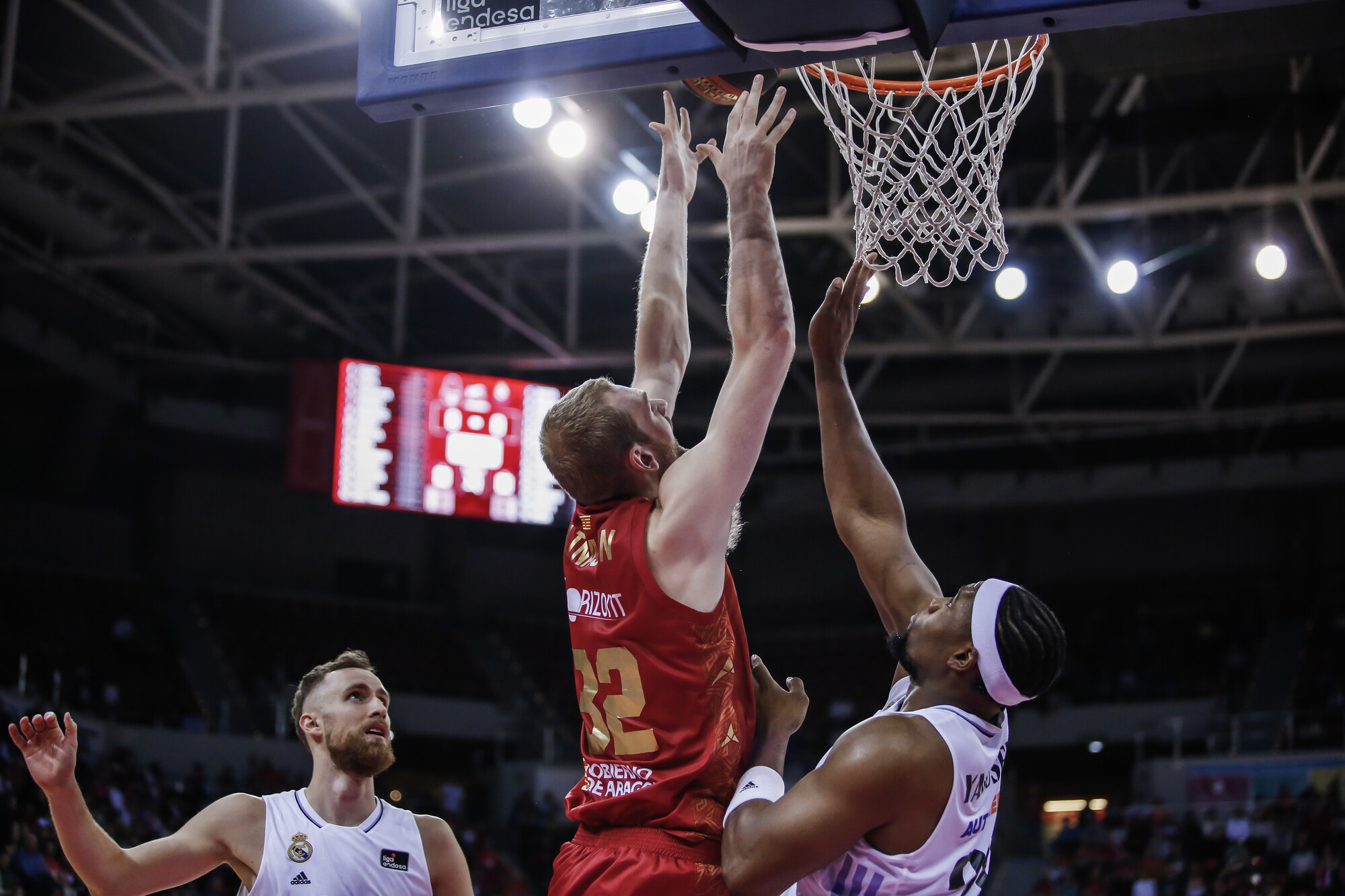 CAZ 48-36 RMB (DESCANSO). El Casademont Zaragoza se marcha mandando al intermedio. El equipo de Porfi Fisac está completando su mejor encuentro de la temporada. Verdadera exhibición en ambas canasta del equipo maño. Jessup (15 puntos) y Mara (8), los mejores por el momento. Y en defensa, dejando al Real Madrid (77,8 puntos anotados de promedio) en menos de 40.
