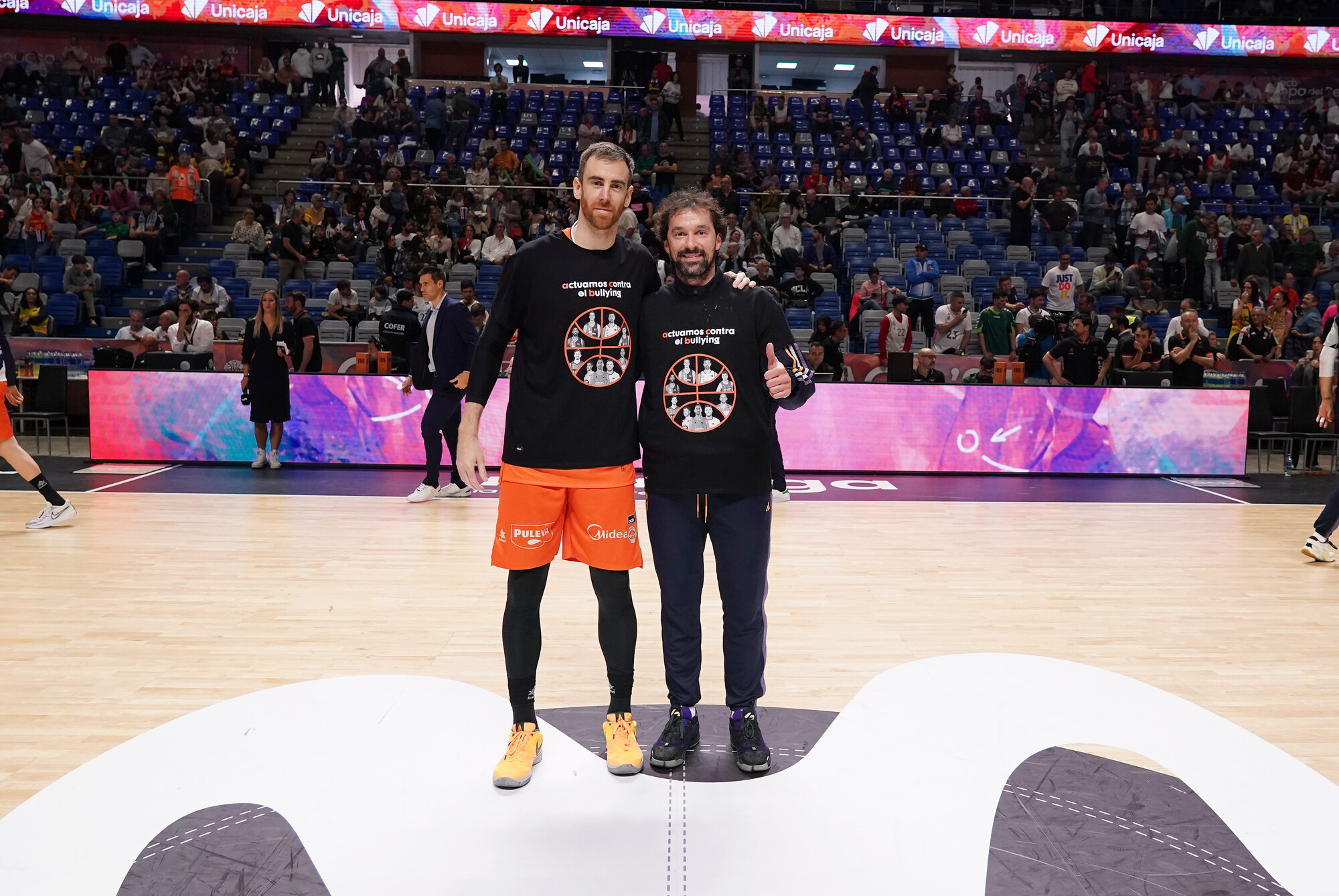 La campaña contra el bullying es una guerra de largo recorrido y, como no, no podia faltar en la Copa. Alberto Díaz lució este camisetón en los cuartos y ahora Claver y Llull cogen el relevo. Ser un referente es esto.