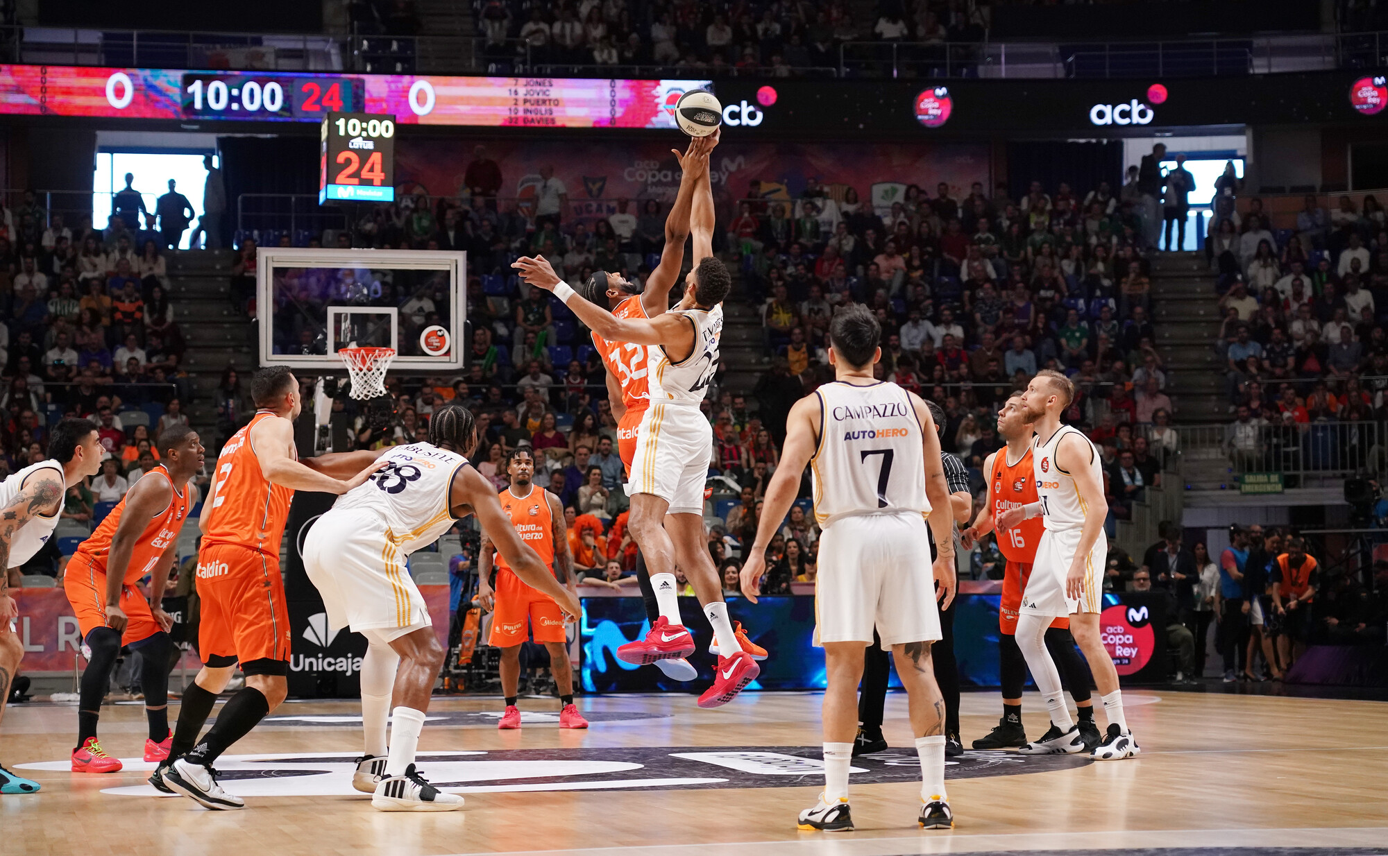 Balón al cielo del Carpena... y Tavares se lleva el salto inicial. Primera posesión para los de Chus Mateo. ¡Las semis ya están en juego!