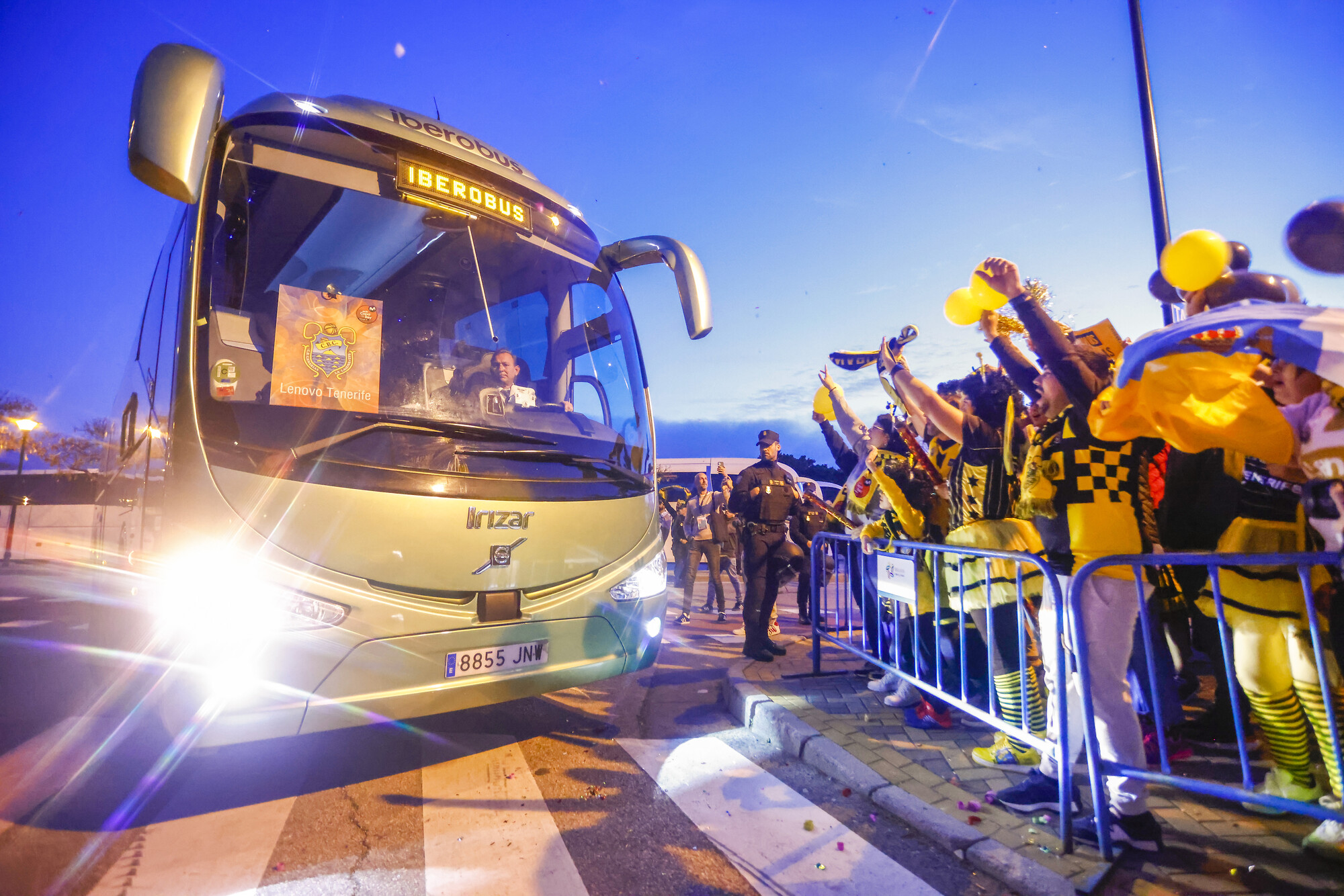 Recibimiento masivo para el autobús del Lenovo Tenerife en su llegada al Martín Carpena. Hay ilusión entre la afición aurinegra. Está en juego la segunda final de su equipo, consecutiva, además.