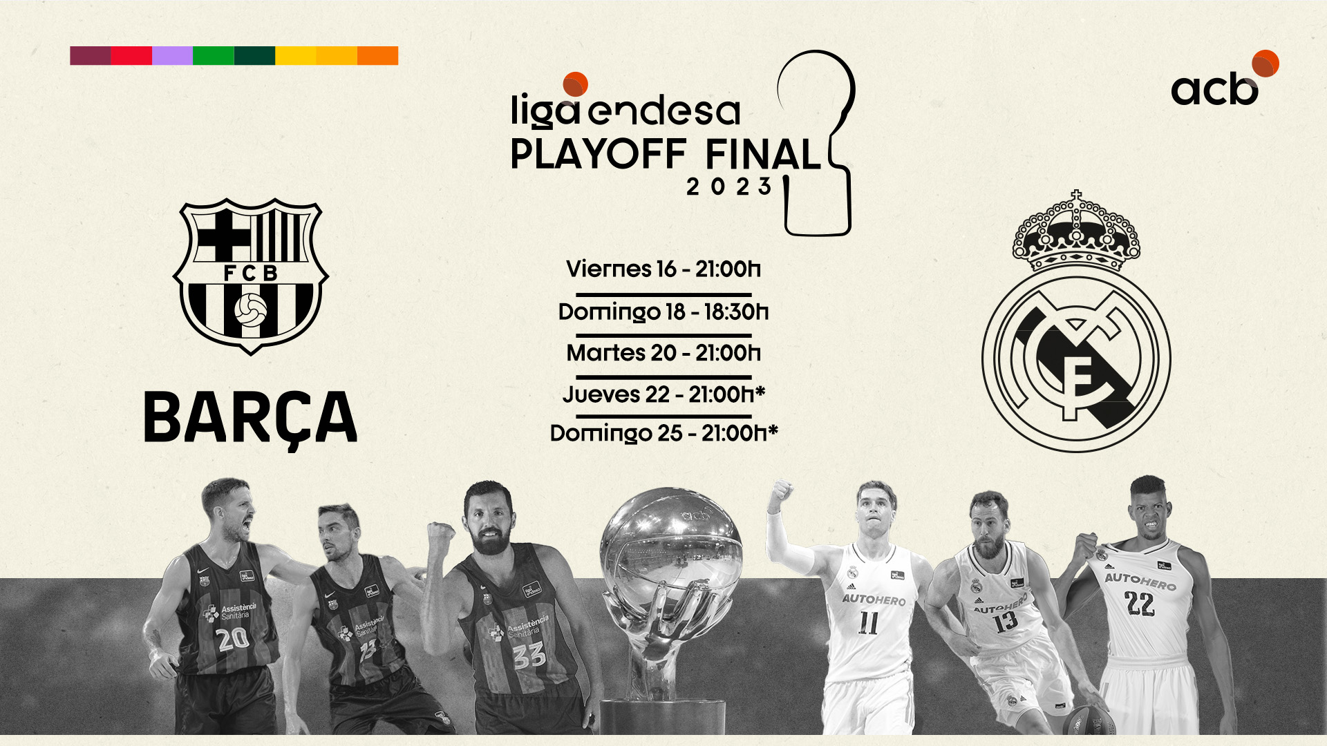 La lucha por el título se reduce a dos aspirantes que hoy a las 21h de la noche disputarán en el Palau Blaugrana el primer partido del Playoff Final 2023. ¿Barça o Real Madrid? ¿Real Madrid o Barça? Solo uno se alzará con el título de campeón de la Liga Endesa. Sean bienvenidos y bienvenidas al clásico de todos los clásicos.