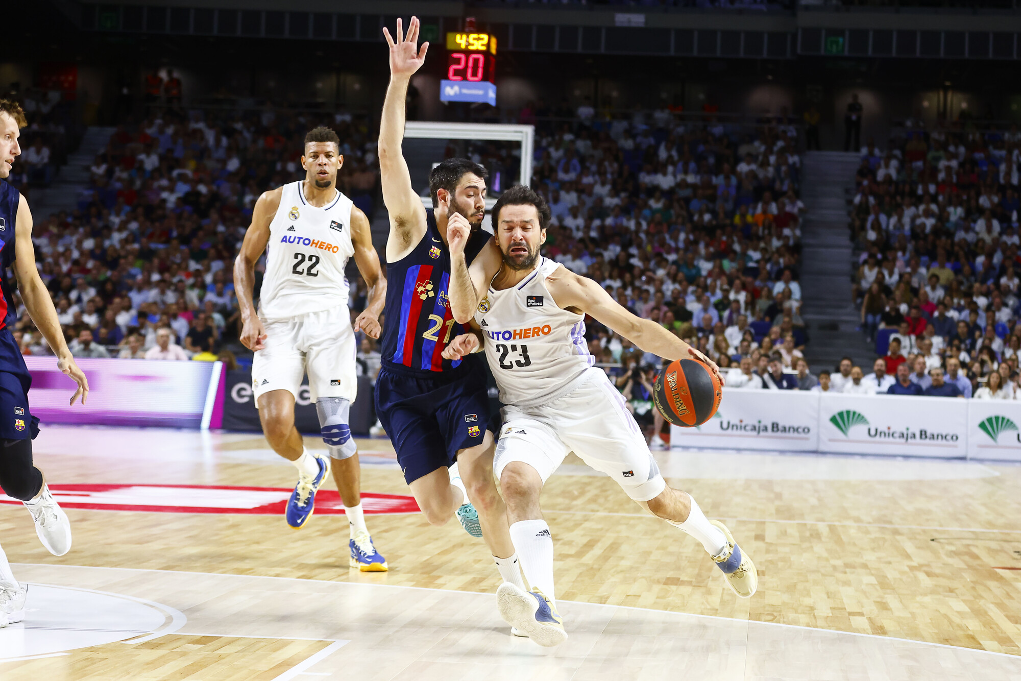 Diecinueve jugadores han anotado, ya, en los primeros veinte minutos, presentando el Barça un 61% en tiros de campo y el Real Madrid un 64%.