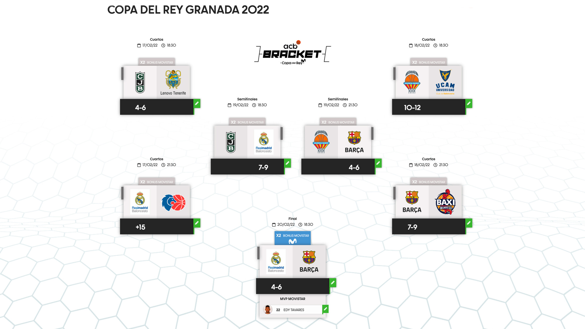 ¿Has rellenado tu Bracket de la Copa del Rey? Pues los entrenadores y directores deportivos de los equipos no clasificados ya tienen el suyo. En esta encuesta oficial previa a la Copa de Granada les pedimos sus pronósticos para cada una de las eliminatorias, así como sus apuestas por el MVP Movistar.