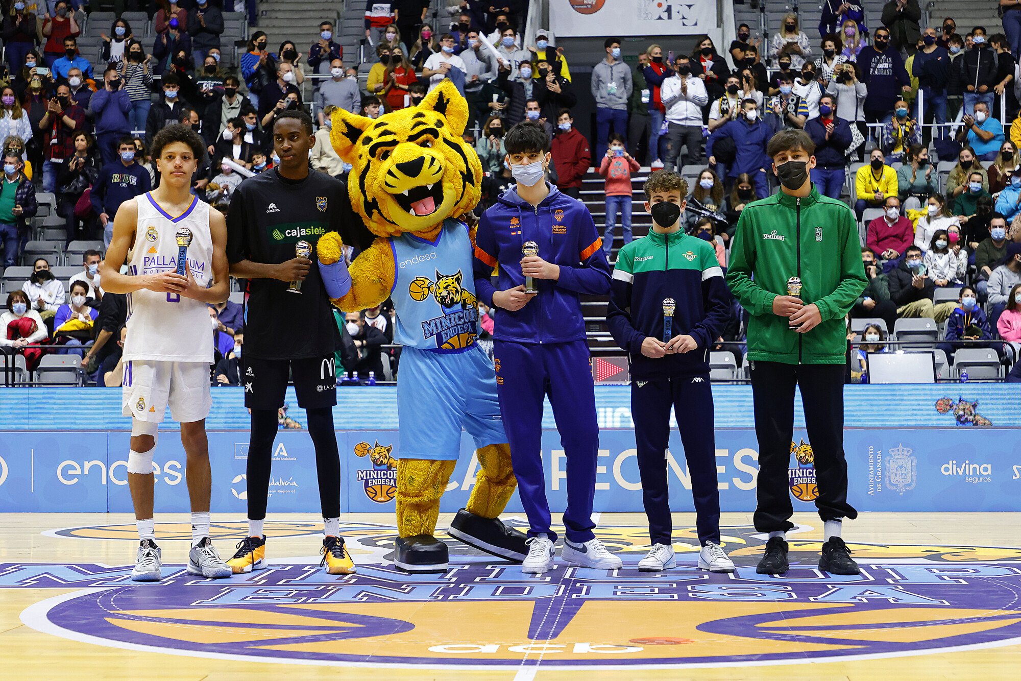 Felipe Quiñones compartió la gloria con cuatro de los grandes protagonistas del torneo, integrantes del Mejor Quinteto de la Minicopa Endesa Granada 2022. Javier Viguer (Valencia Basket), Ricardo Castilla (Coosur Real Betis), Diego Niebla (Joventut Badalona) y Babel Lipasi (Cajasiete Canarias).
