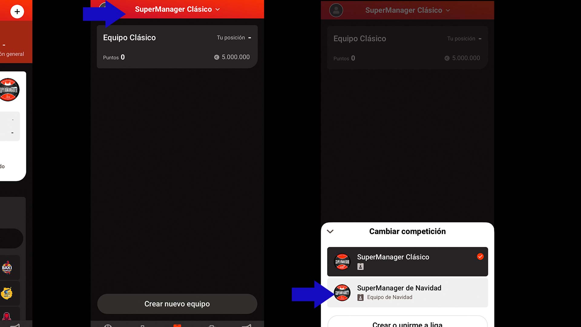 Para entrar al SuperManager acb de Navidad 2024-25, ve a Mis Equipos y pincha en el desplegable superior (donde pone 'SuperManager Clásico' y una flecha hacia abajo). Te aparecerán las dos competiciones activas: Clásico y Navidad. Elige Navidad y crea tu equipo del SM de Navidad.