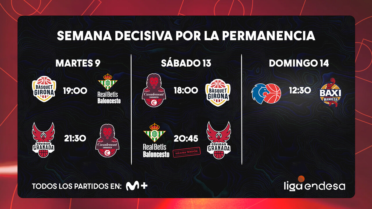 A las 19h, para empezar, Bàsquet Girona (14º, 10-21) busca sellar su permanencia ante un Real Betis (16º, 9-22) que ha conseguido abandonar los dos últimos puestos, pero al que aún le queda camino por recorrer para salir del peligro. Los de Aíto, quiénes ya ganaron en la ida por 71-79, se salvarán si ganan en Fontajau o si pierde Coviran Granada (17º, 8-23).