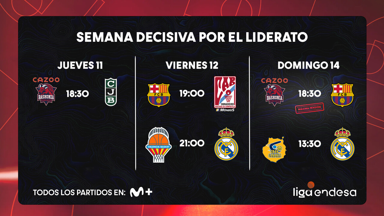 El Cazoo Baskonia es el líder provisional en solitario tras ganar ayer en Badalona. El Barça le alcanzará con una victoria (mejor diferencia de puntos general, por lo que serían primeros), mientras el Real Madrid quiere seguir al acecho de las dos primeras posiciones.