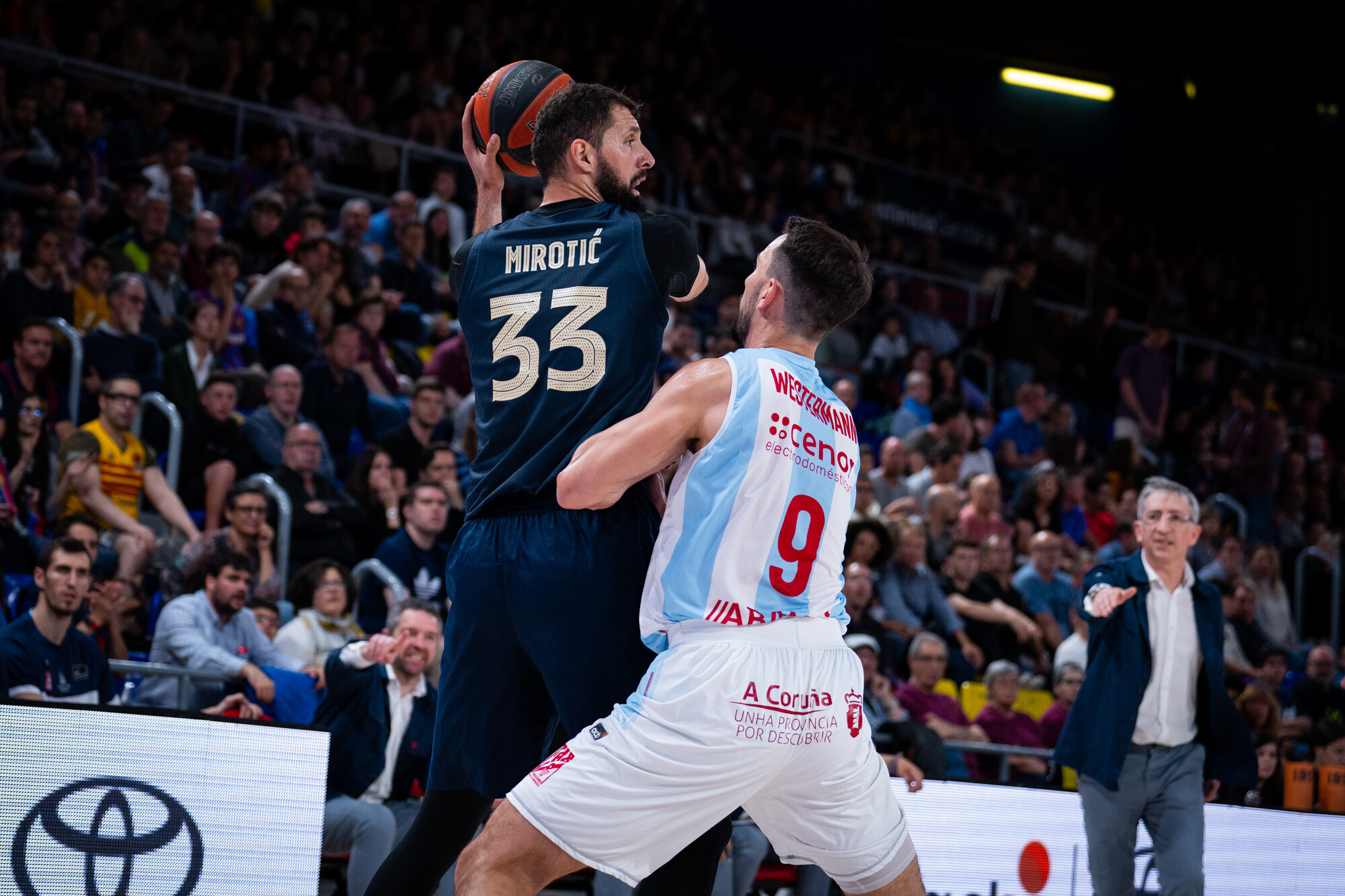 BAR 13-12 MOB (min. 5). Muy peleado inicio de partido. El Monbus Obradoiro no se arruga y llegó a disponer de ventaja en el marcador en diversos momentos. El Barça manda ahora mismo espoleado por un arranque muy acertado de una de sus estrellas: Nikola Mirotic (5 puntos, 4 rebotes y 12 de valoración).