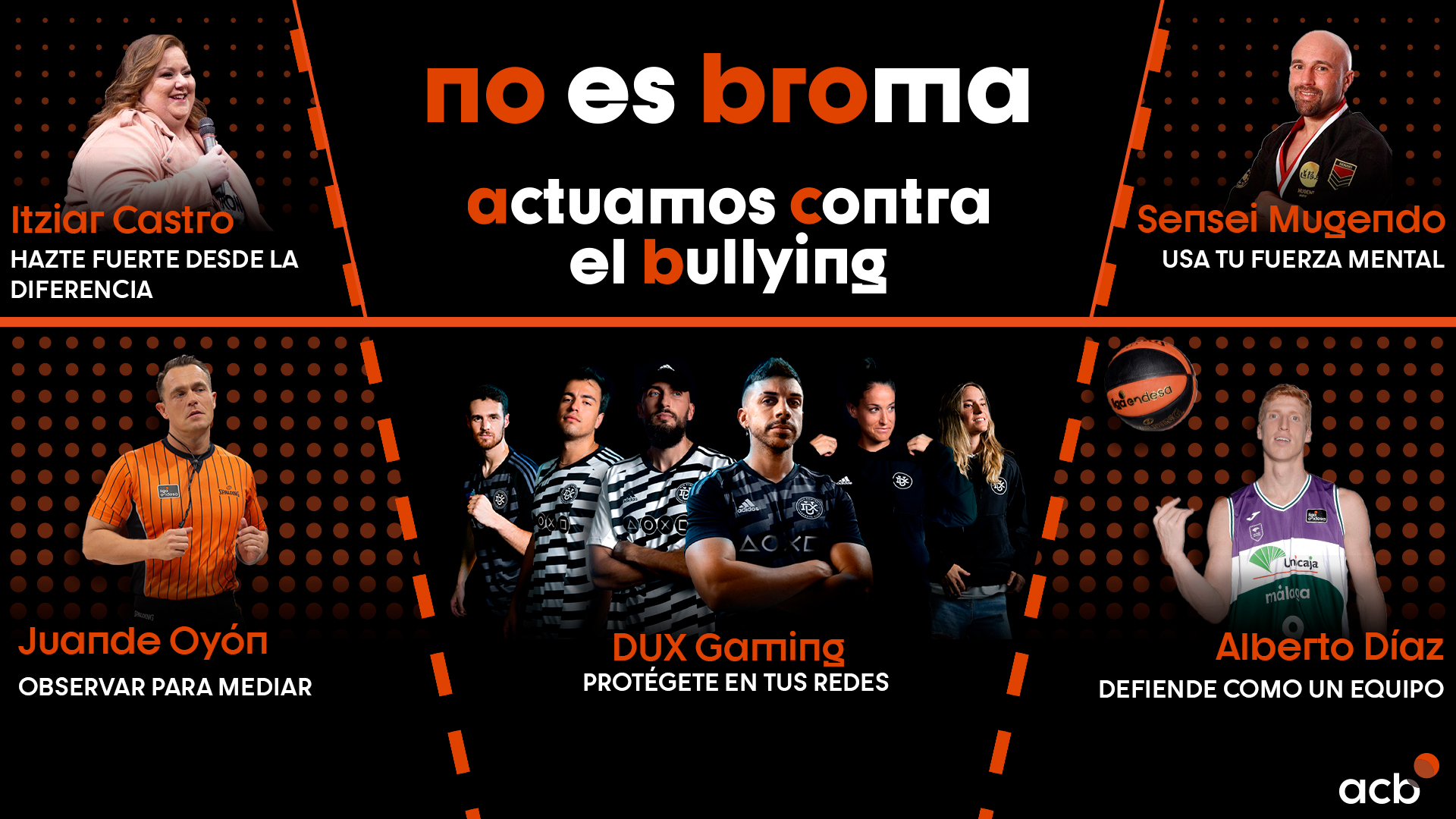 Actuamos contra el Bullying: Itziar Castro, el Sensei Mugendo Javier Saenz, Alberto Díaz, Juande Oyón y Team DUX Gaming, junto a la acb contra el acoso escolar