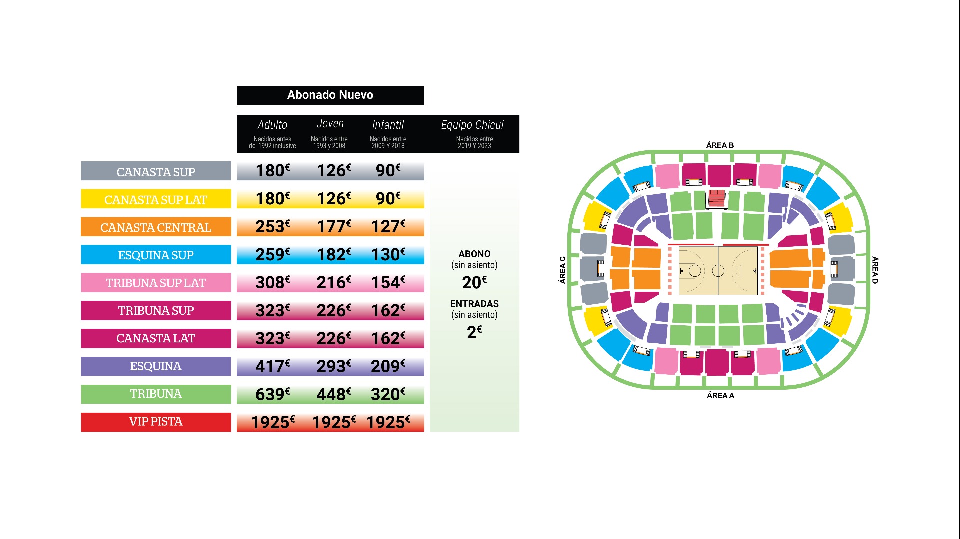 Ser abonado es muy sencillo. Desde 180 € (Adulto), 126 € (Joven) y 90 € (Infantil) podrás asistir a los partidos que se disputen en el Martín Carpena en Liga Endesa (Liga Regular y Playoff) y BCL (Regular Season, Round of 16 y Playoff). Todo, a un precio cerrado. Sin sorpresas. Y lo puedes pagar en 12 meses SIN INTERESES.
