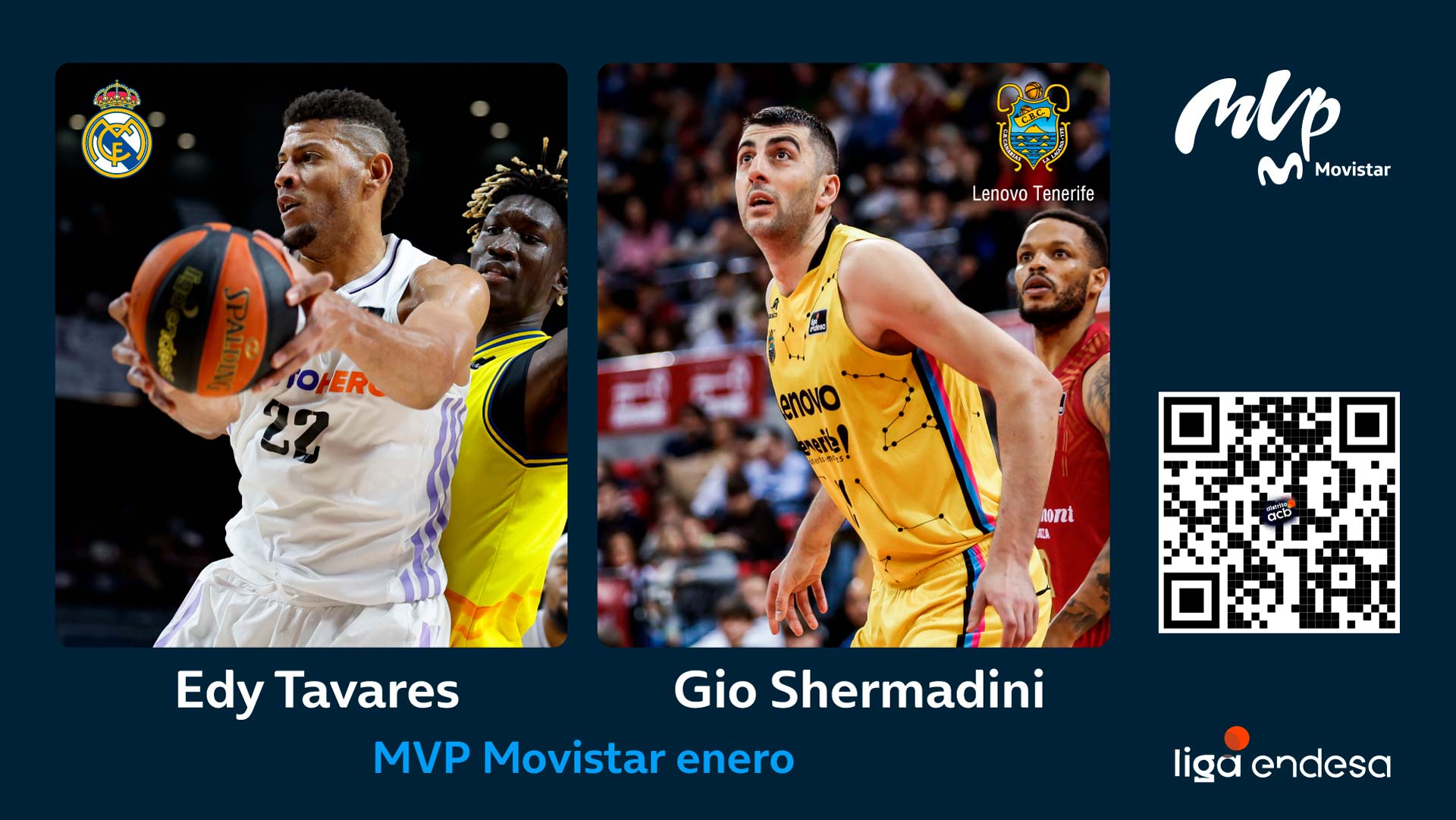 El georgiano del Lenovo Tenerife y el caboverdiano del Real Madrid han logrado una valoración media de 26,8 créditos por encuentro, cifra que les lleva a compartir la designación como MVP Movistar del mes de enero