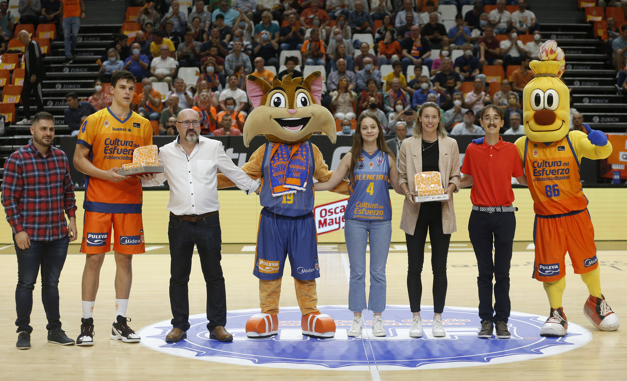 En los prolegómenos del partido Jaime Pradilla y Anna Gómez han recibido el Trofeo al Esfuerzo 2021-22, premio que entrega el Valencia Basket y que es elegido por sus propios aficionados.