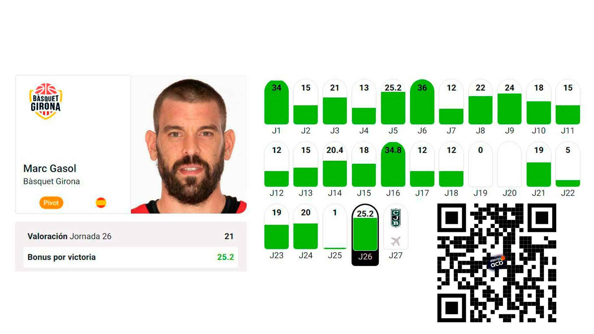 El pívot del Bàsquet Girona es uno de los jugadores más fiables del juego. Ha puntuado cinco veces por encima de 25; nueve de 20 y 17 de 15. ¡Y solo ha bajado dos veces de 10 en toda la temporada!