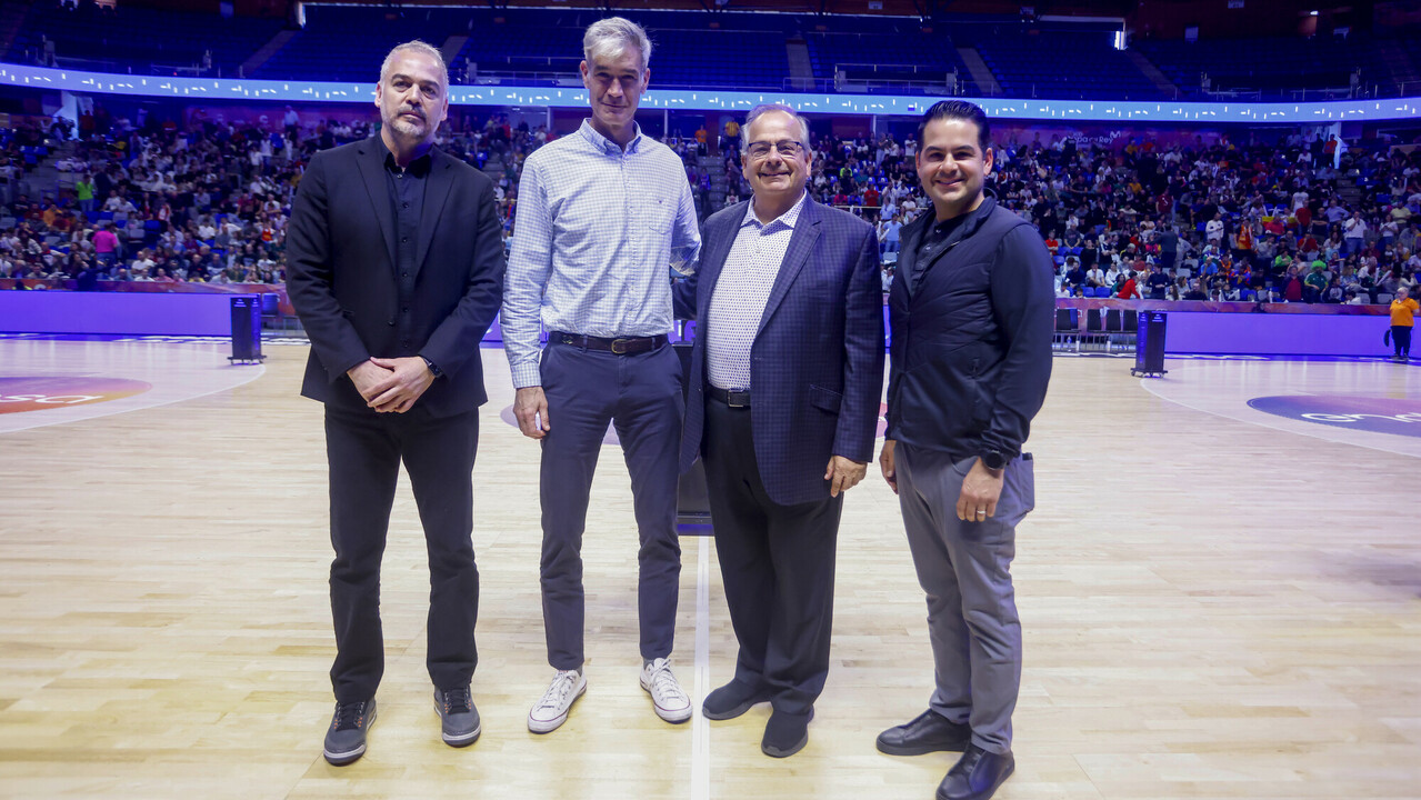 En la imagen, de izquierda a derecha, el Ingeniero Alonso Izaguirre, Comisionado general LNBP, D. Antonio Martín, presidente de la acb, el Ingeniero Rafael Carrillo Barrón, representante de la Cibacopa y presidente de los Zonkeys de Tijuana, y D. Rafael Carrillo Fregoso, representante de los Zonkeys de Tijuana.