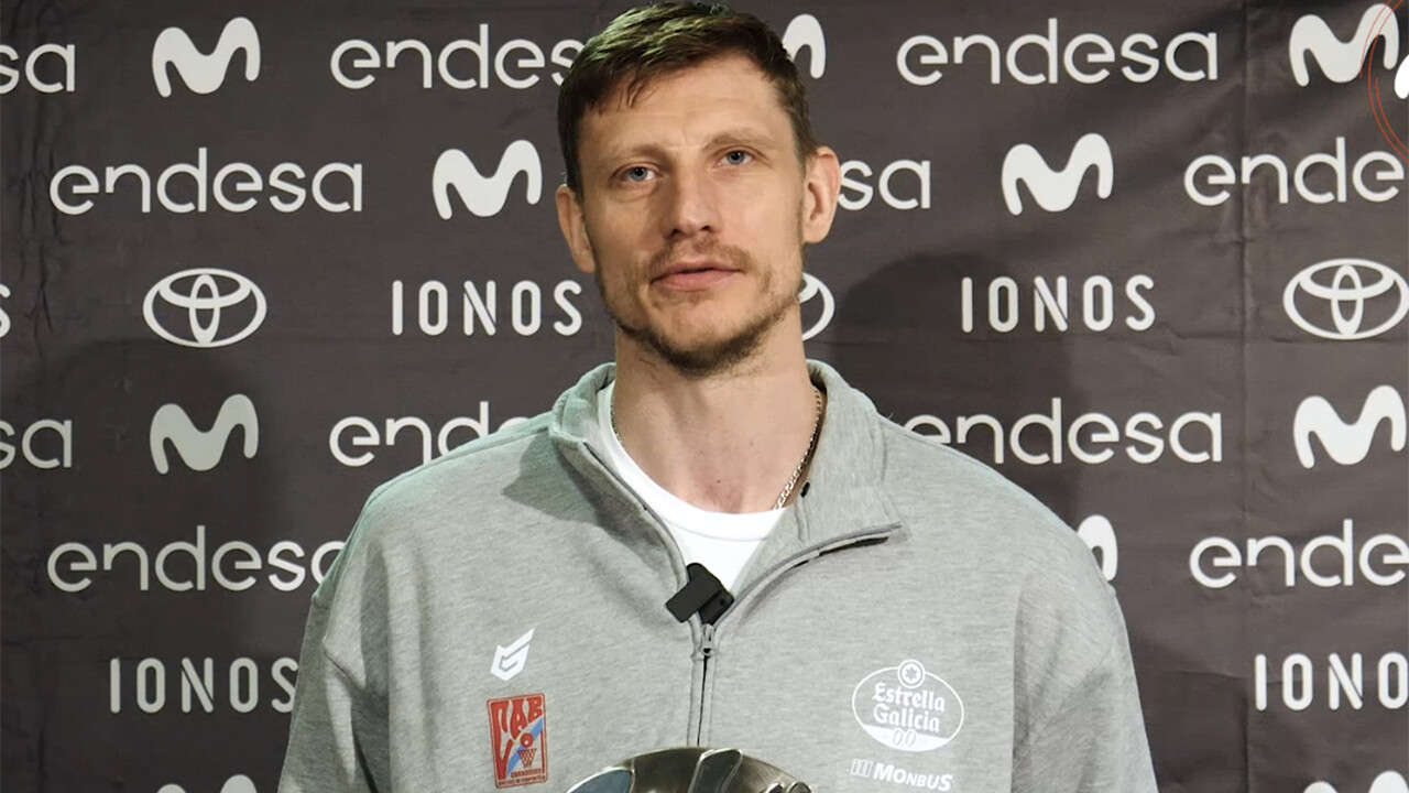 El pívot del Monbus Obradoiro Artem Pustovyi ha recibido el trofeo que le acredita como MVP Movistar del mes de mayo
