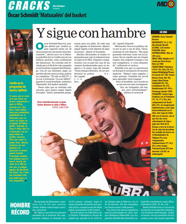 Piezas informativas recurrentes que se recreaban en sus récords, sus títulos (la liga brasileña con Corinthians, el campeonato paulista con Mackenzie) o sus exhibiciones. En la 97-98, con Bandeirantes de São Paulo, 41,5 puntos de media y 74 en un partido haciendo de presidente-jugador. Que si 40.000 tantos a los 40 años ("Yo estaba tranquilo, era el balón el que temblaba en mis manos"), que si fuegos artificiales y placas de bronce por la efeméride, que si queda poco para superar el tope anotador de Abdul Jabbar.