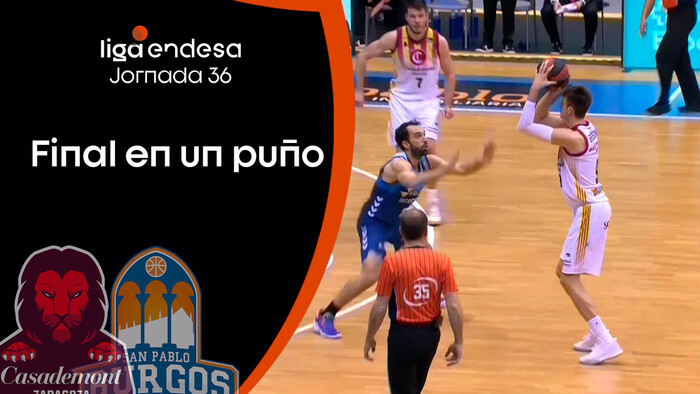 En un partido loco, con idas y venidas en el marcador, Casademont Zaragoza derrotó a Hereda San Pablo Burgos (95-98). Los locales remontaron en el tercer cuarto, pero decidió la victoria un triple de Brussino (16 puntos) a dos segundos del final. Harris (22 puntos y 26 de valoración) mantuvo un bello duelo con McFadden (27 puntos)