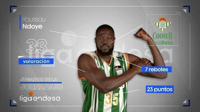 Tras completarse la Jornada 30, se confirma la designación como mejor jugador de la misma de Youssou Ndoye quien, con 33 créditos de valoración, lideró el triunfo del Coosur Real Betis frente al Acunsa Gipuzkoa Basket