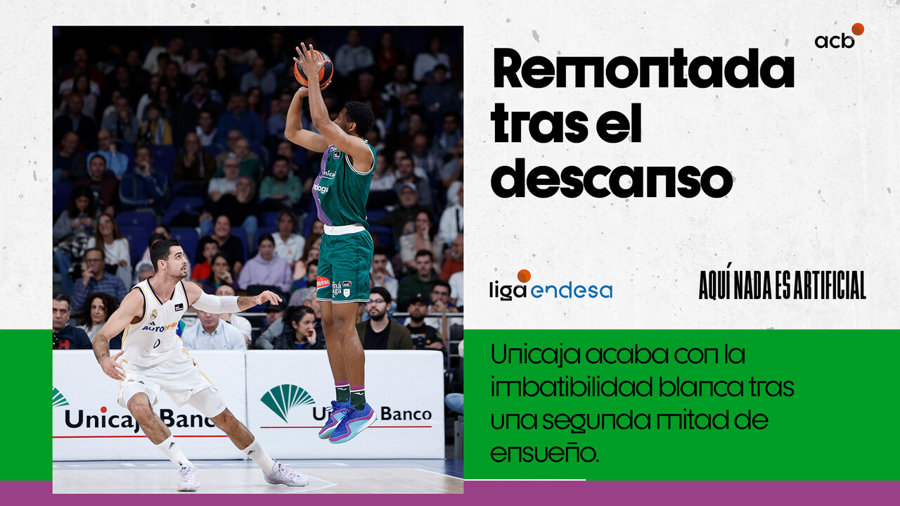 15 años después, el Unicaja venció en la cancha del Real Madrid. Y lo hizo de la forma más heroica, remontando 21 puntos en una exhibición para el recuerdo. ¡Así fue su remontada!