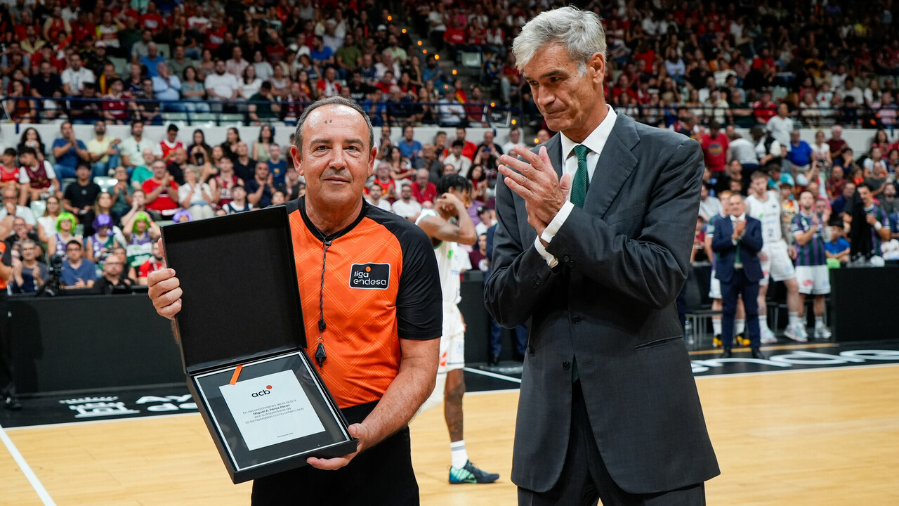 El colegiado recibió un homenaje instantes previos a la disputa del UCAM Murcia-Unicaja, su último partido acb tras 25 temporadas.