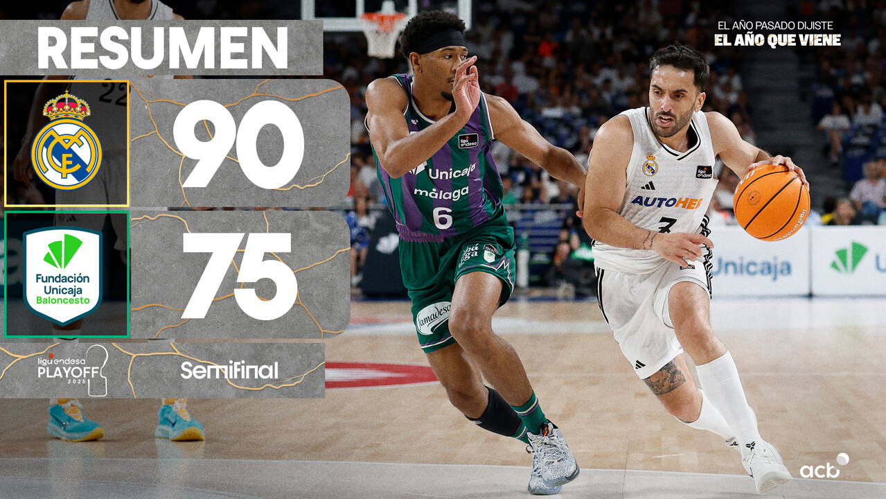 Pese a los intentos de remontada del Unicaja, el Real Madrid defendió su feudo con uñas y dientes para sumar un triunfo que coloca el 2-0 en la serie (90-75). Colosal Campazzo, con 18 puntos y 4 asistencias